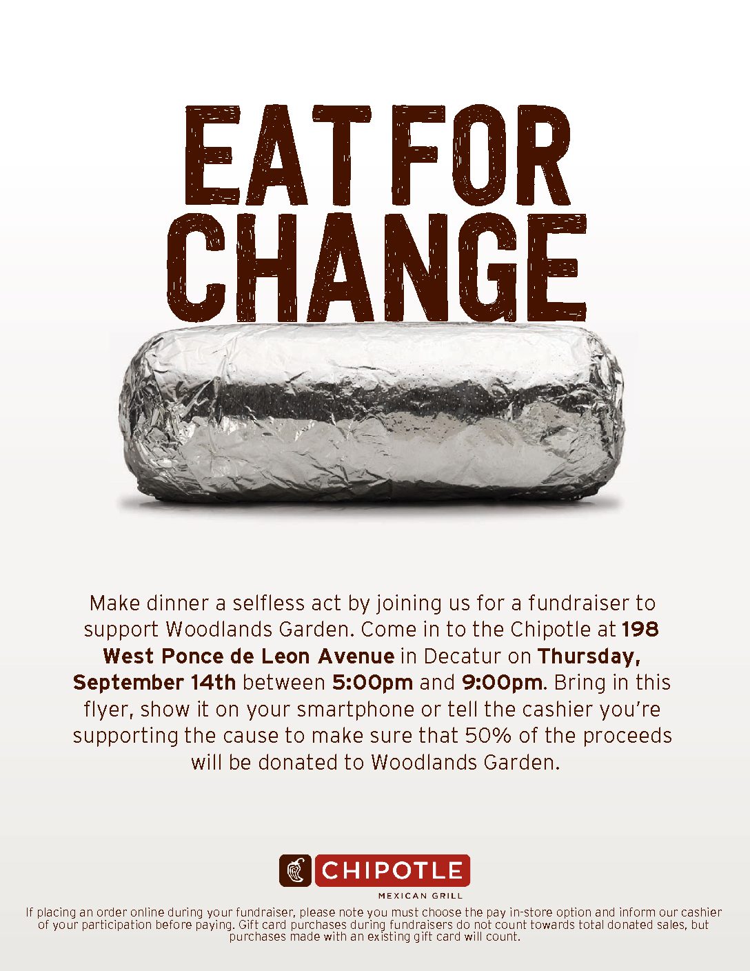 Make dinner a selfless act by joining us for a fundraiser to support Woodlands Garden. Come into the Chipotle at 198 West Ponce de Leon Avenue in Decatur on Thursday, September 14th between 5-9pm. Bring in the flyer, who it on your smartphone or tell the cashier you’re supporting the cause to make sure that 50% of the proceeds will be donated to Woodlands Garden.